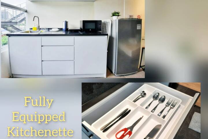A fully equipped kitchen/kitchenette in a hotel studio suite or rental apartment will include a refrigerator/freezer, kitchen sink, a stove, silverware, dishware, cookware, and basic cooking utensils, and some dish cleaning supplies, like a drain rack, dish soap, a sponge and paper towels. ▸ words that often appear near kitchenette. It would be incorrect to call it a kitchen because it doesn't include all the appliances and fixtures that a regular. How to use kitchenette in a sentence. Equipped for reading success book.